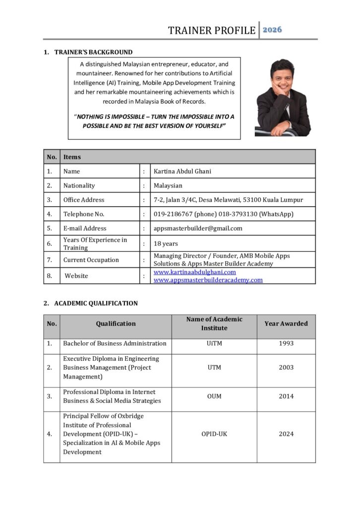 Coach Kartina is a very dedicated, up to date and passionate trainer. You can never go wrong with her guidance and support system. Thank you Coach for all the knowledge and guidance. I highly recommend her for people who wants to learn about Mobile Apps and AI tools.
